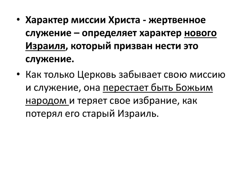 • Характер миссии Христа - жертвенноеслужение – определяет характер нового
