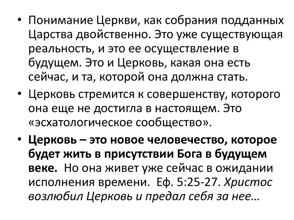 • Понимание Церкви, как собрания подданныхЦарства двойственно. Это уже существующая