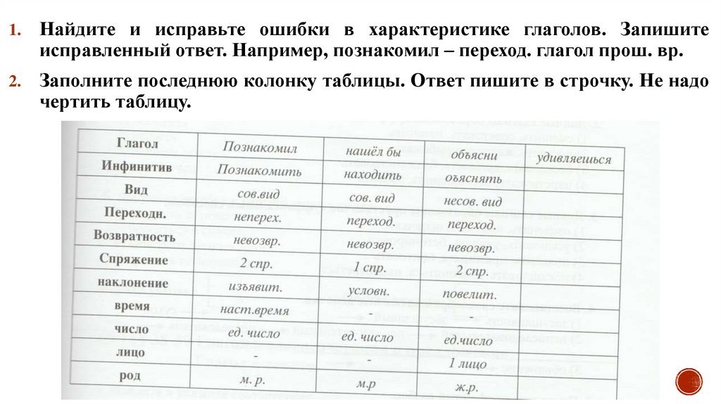 1.Найдите и исправьте ошибки в характеристике глаголов. Запишите
