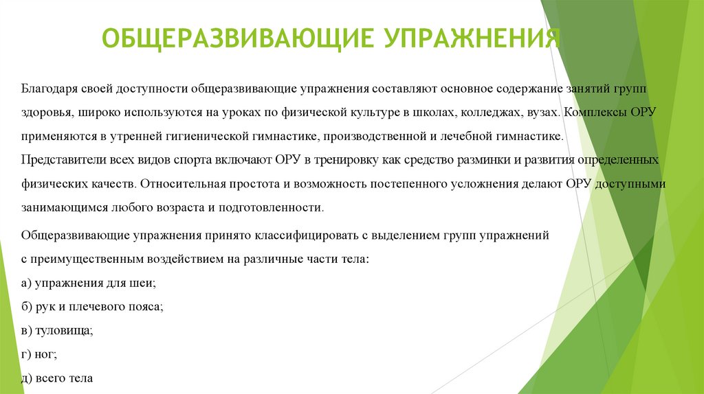ОБЩЕРАЗВИВАЮЩИЕ УПРАЖНЕНИЯБлагодаря своей доступности общеразвивающие упражнения составляют основное содержание занятий групп