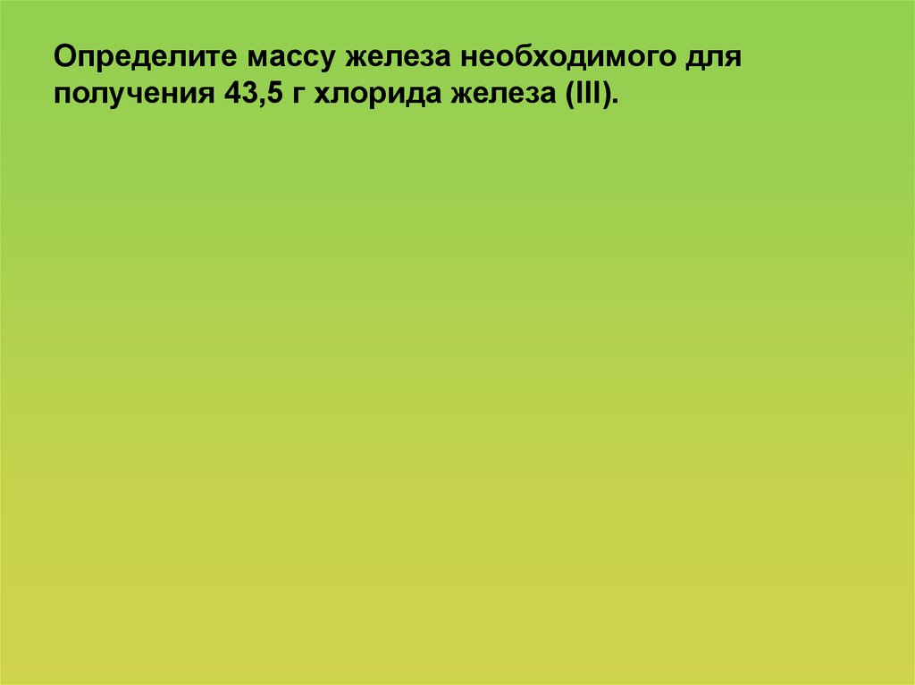 Определите массу железа необходимого дляполучения 43,5 г хлорида железа (ІІІ).