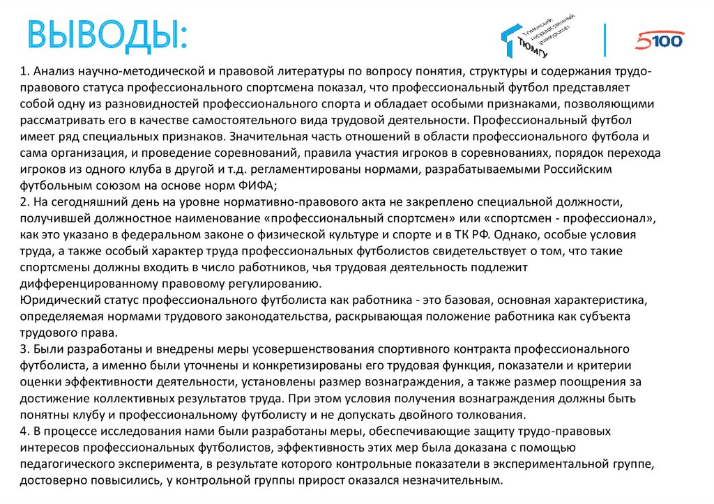 ВЫВОДЫ:1. Анализ научно-методической и правовой литературы по вопросу понятия, структуры и содержания трудоправового статуса профессионального спортсмена показал, что профессиональный футбол представляет