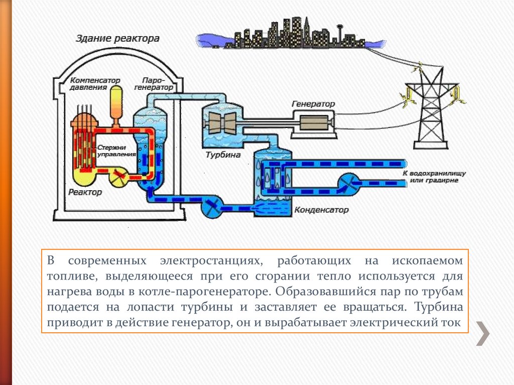 В современных электростанциях, работающих на ископаемомтопливе, выделяющееся при его сгорании тепло используется для