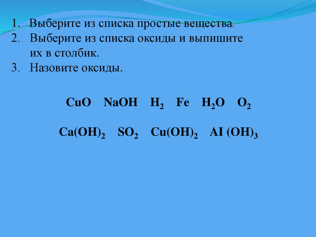 1. Выберите из списка простые вещества.2. Выберите из списка оксиды и выпишите