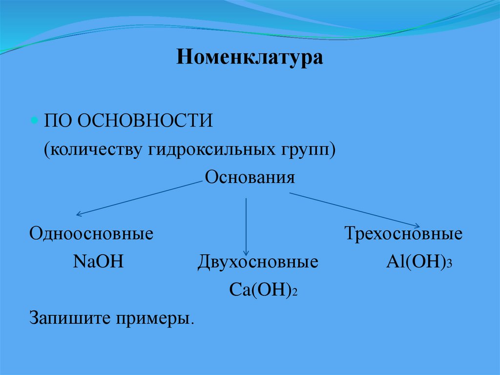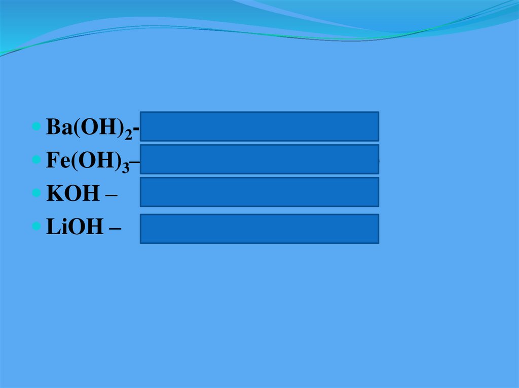 Ba(OH)2- гидроксид барияFe(OH)3– гидроксид железа (III)
