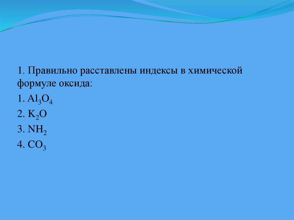 1. Правильно расставлены индексы в химическойформуле оксида: