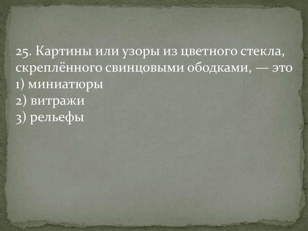 25. Картины или узоры из цветного стекла,скреплённого свинцовыми ободками, — это