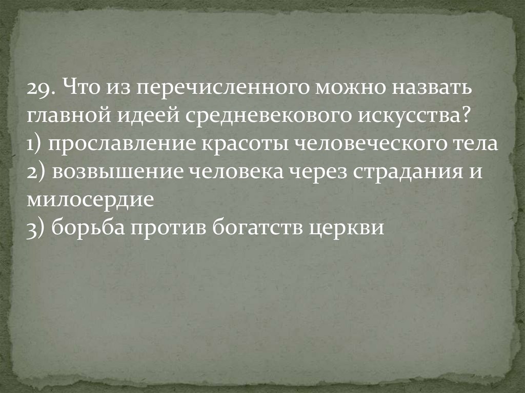 29. Что из перечисленного можно назватьглавной идеей средневекового искусства?