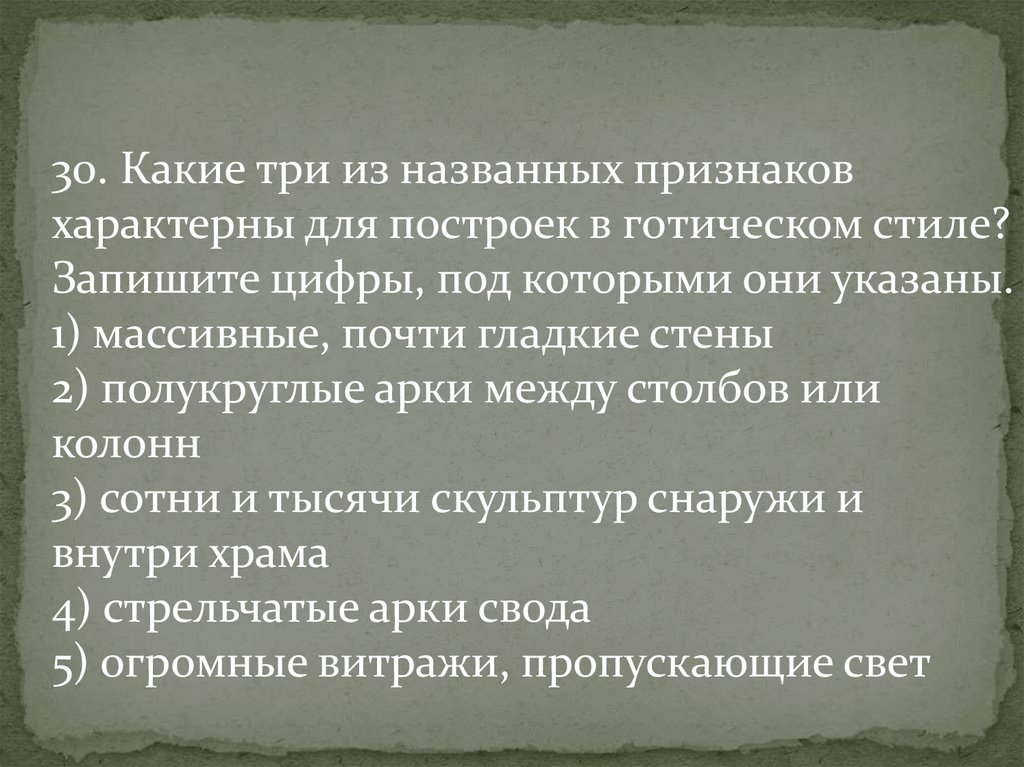 30. Какие три из названных признаковхарактерны для построек в готическом стиле?