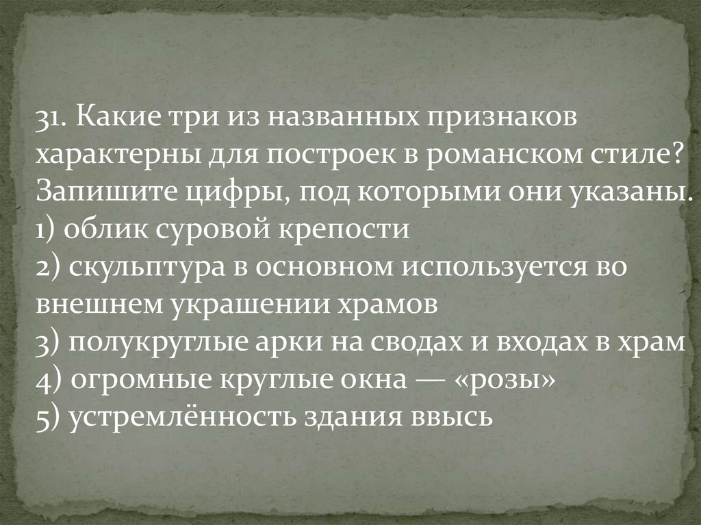 31. Какие три из названных признаковхарактерны для построек в романском стиле?