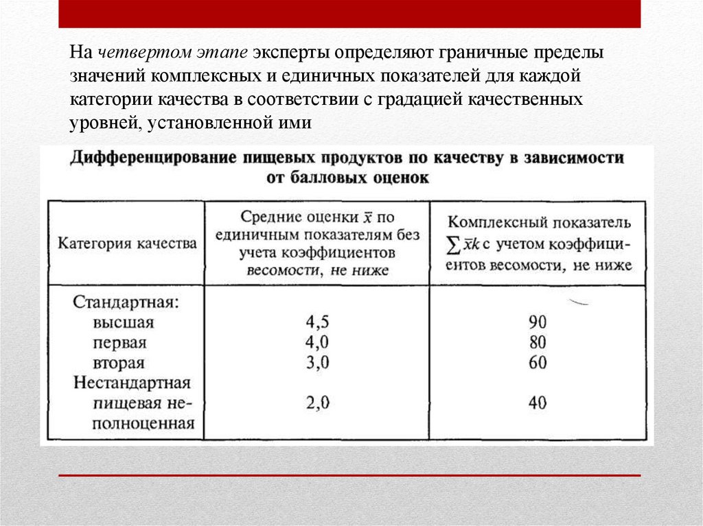 На четвертом этапе эксперты определяют граничные пределызначений комплексных и единичных показателей для каждой