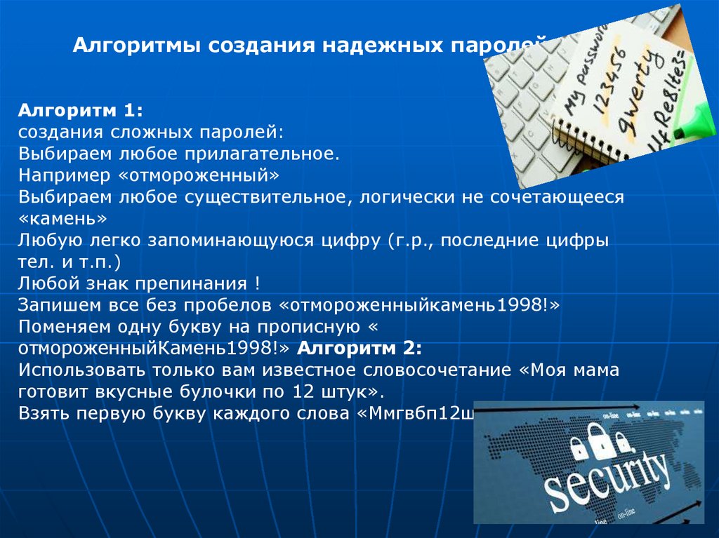 Алгоритмы создания надежных паролей:Алгоритм 1: