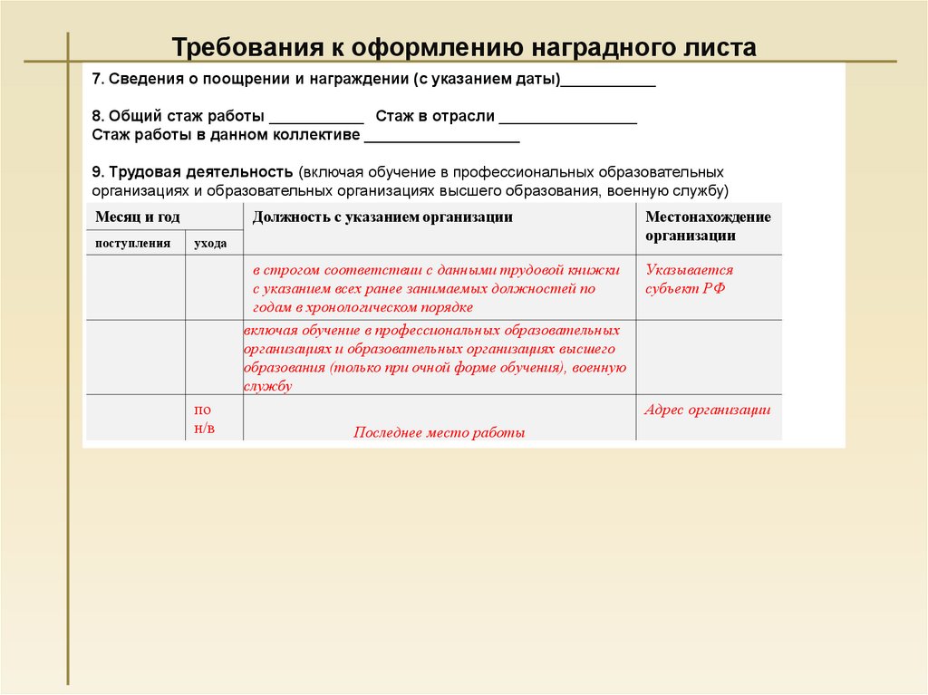 9. Требования к оформлению наградного листа