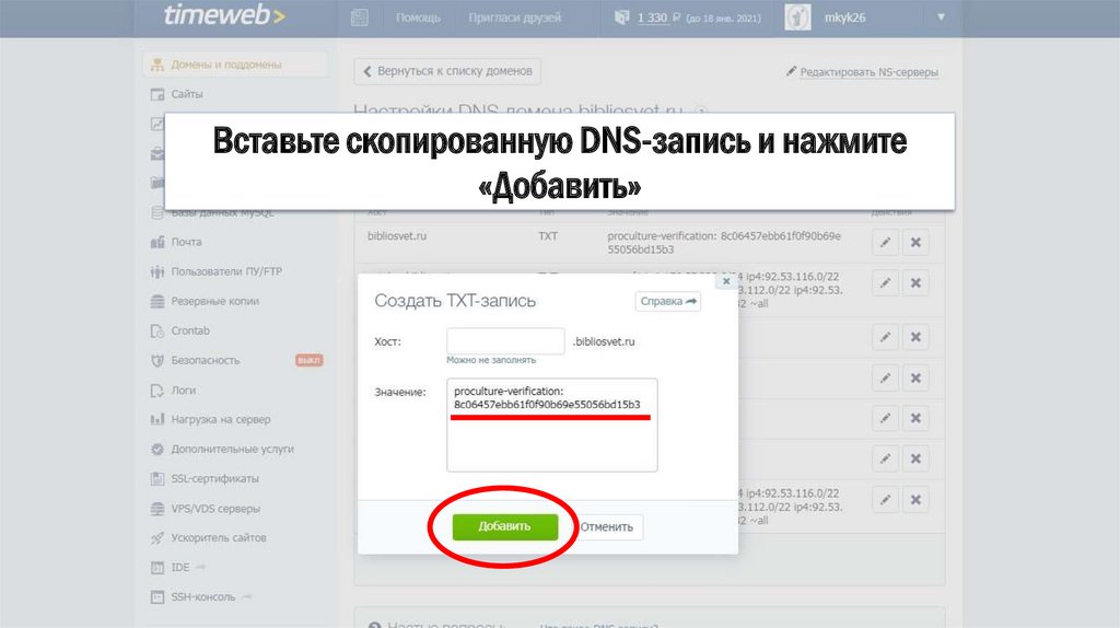 Вставьте скопированную DNS-запись и нажмите«Добавить»