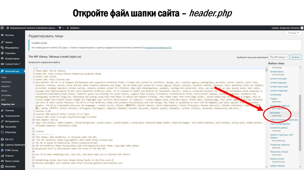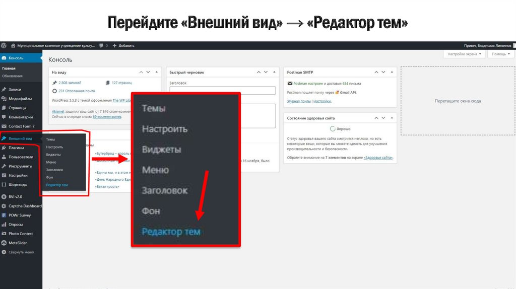 Перейдите «Внешний вид» → «Редактор тем»20.