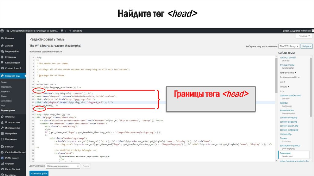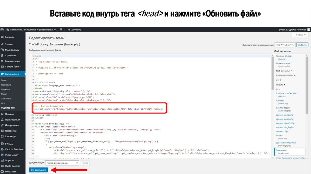 Вставьте код внутрь тега <head> и нажмите «Обновить файл»23.
