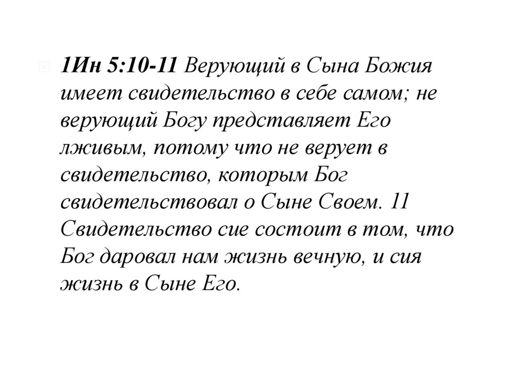 1Ин 5:10-11 Верующий в Сына Божияимеет свидетельство в себе самом; не