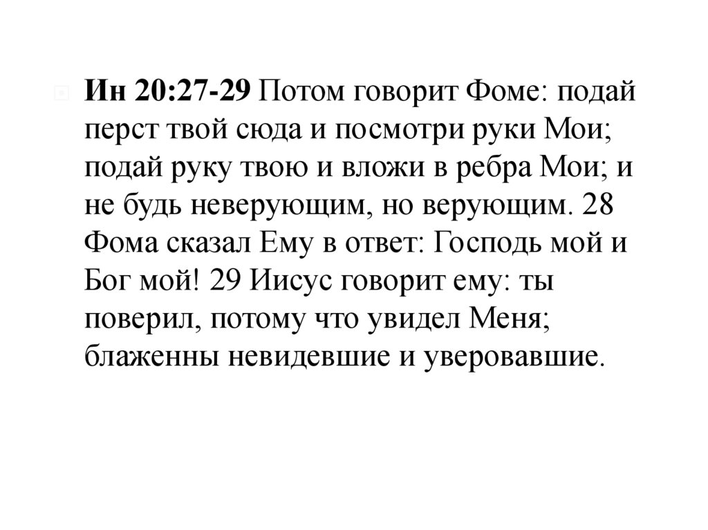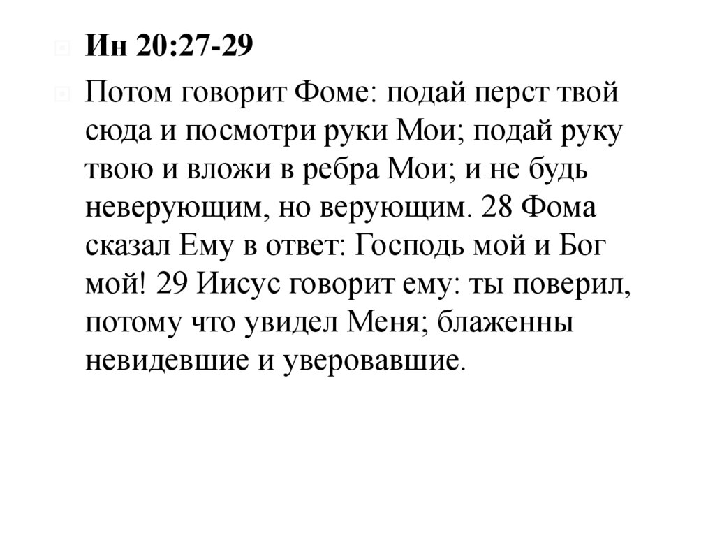 Ин 20:27-29 Потом говорит Фоме: подайперст твой сюда и посмотри руки Мои;