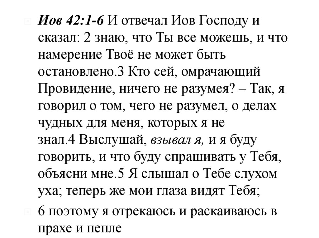 Иов 42:1-6 И отвечал Иов Господу исказал: 2 знаю, что Ты все можешь, и что