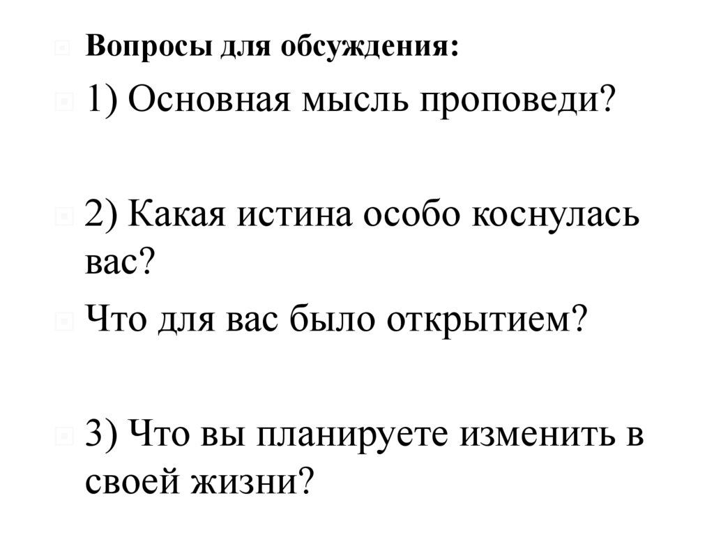 Вопросы для обсуждения:1) Основная мысль проповеди?