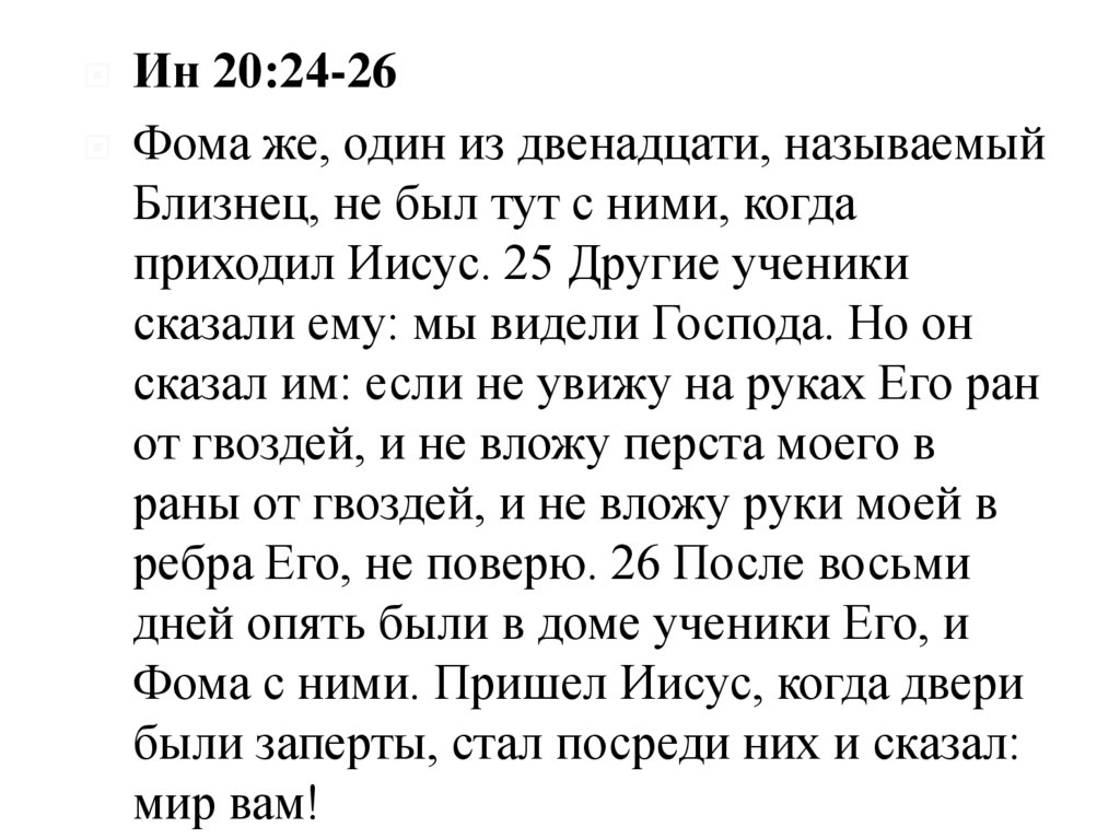 Ин 20:24-25 Фома же, один издвенадцати, называемый Близнец, не был