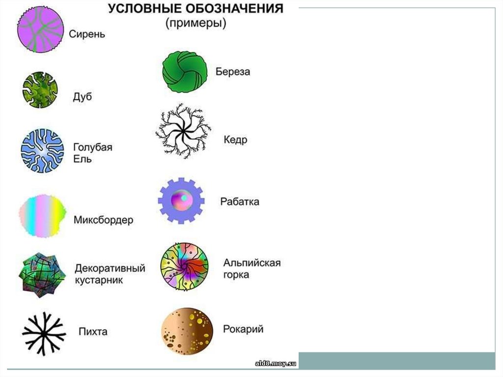 -Наносить условные обозначения на план ландшафтного