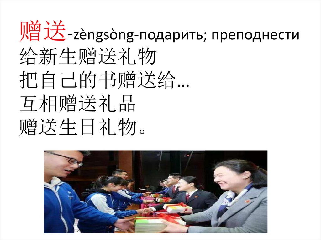 赠送-zèngsòng-подарить; преподнести给新生赠送礼物