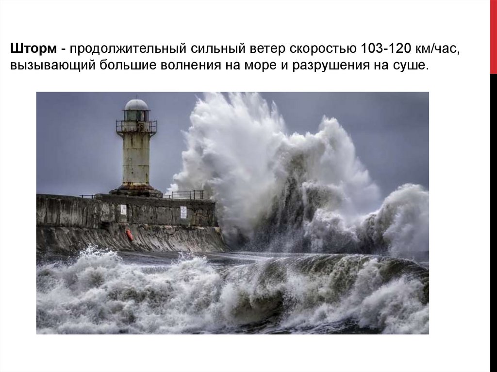 Шторм - продолжительный сильный ветер скоростью 103-120 км/час,вызывающий большие волнения на море и разрушения на суше.