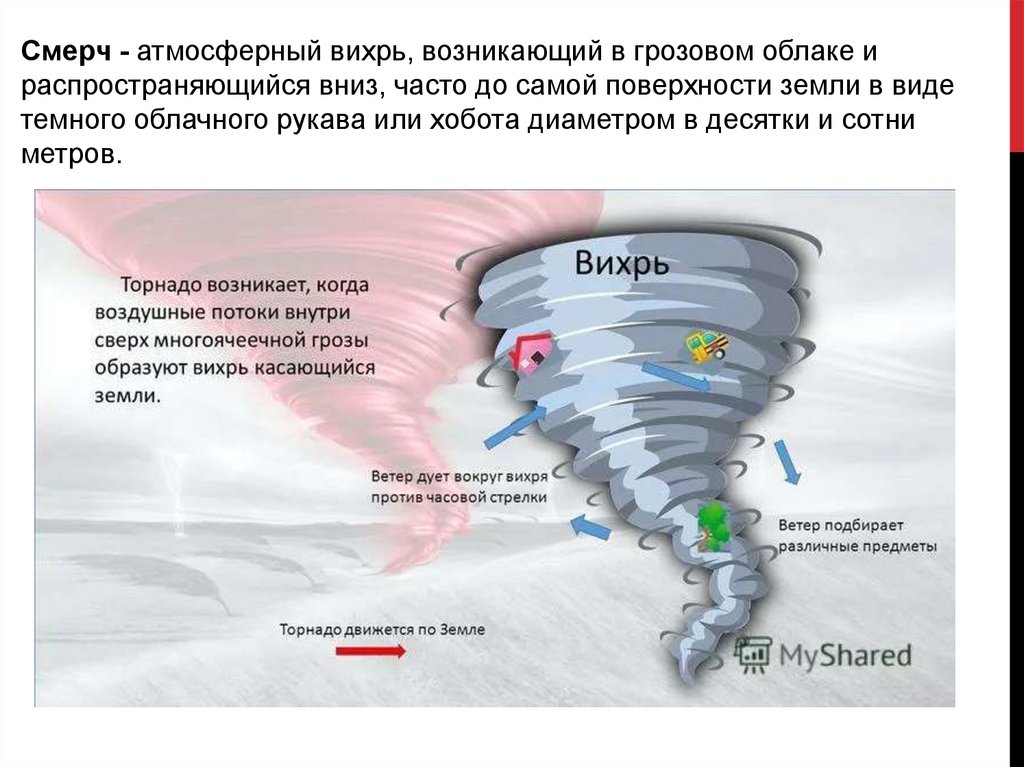Смерч - атмосферный вихрь, возникающий в грозовом облаке ираспространяющийся вниз, часто до самой поверхности земли в виде