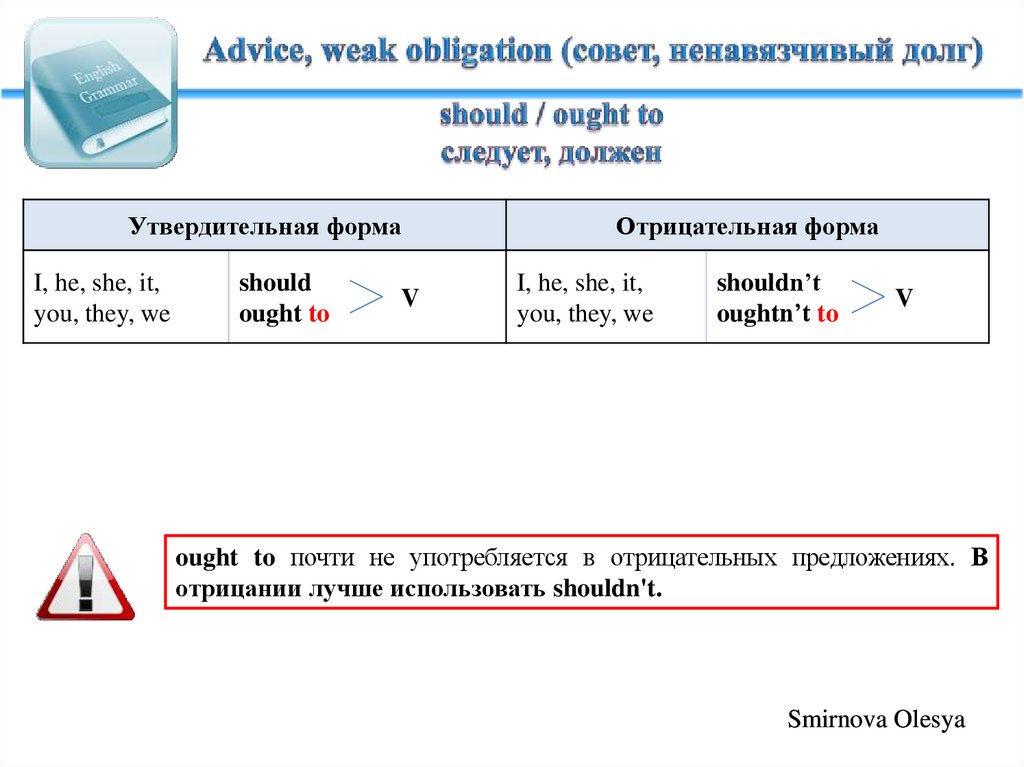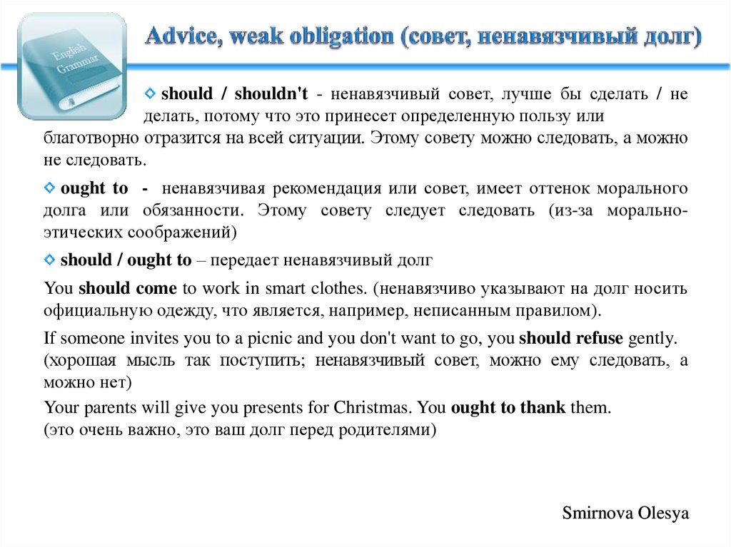 ought to - ненавязчивая рекомендация или совет, имеет оттенок морального