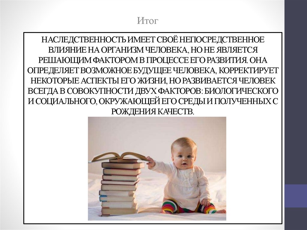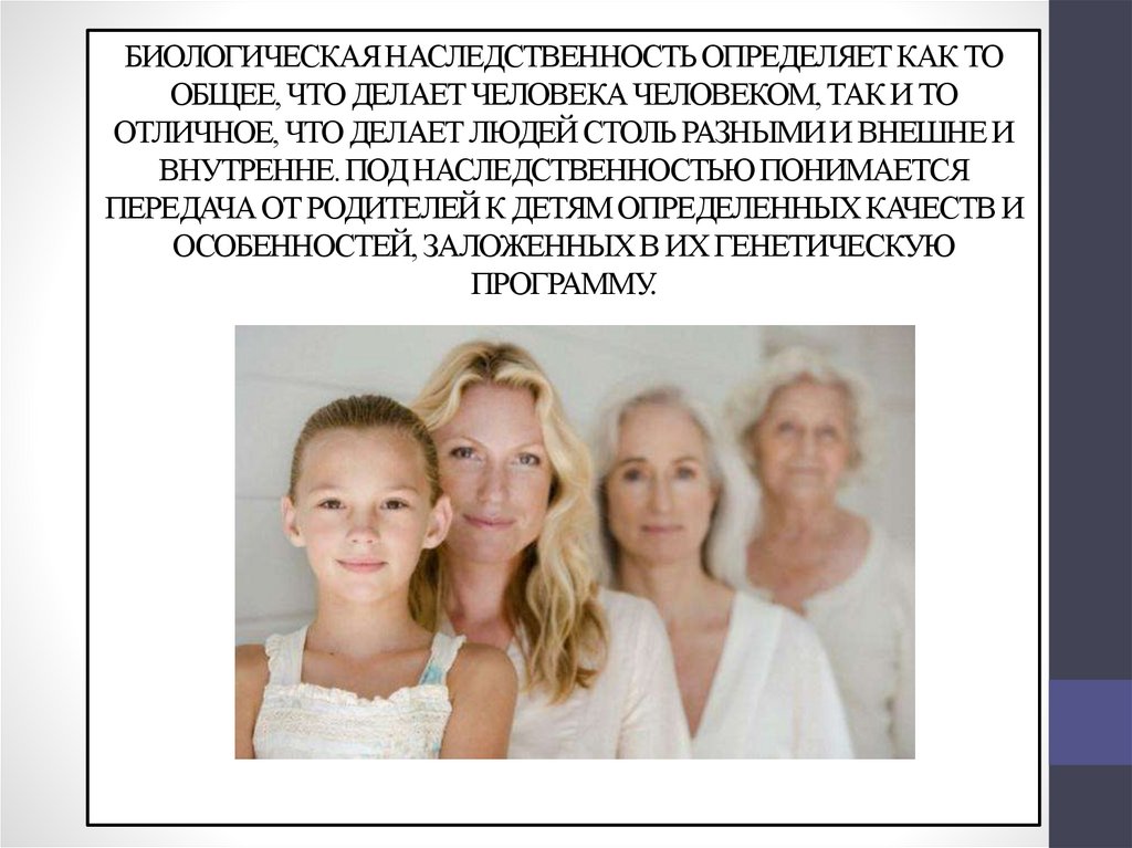 БИОЛОГИЧЕСКАЯ НАСЛЕДСТВЕННОСТЬ ОПРЕДЕЛЯЕТ КАК ТООБЩЕЕ, ЧТО ДЕЛАЕТ ЧЕЛОВЕКА ЧЕЛОВЕКОМ, ТАК И ТО