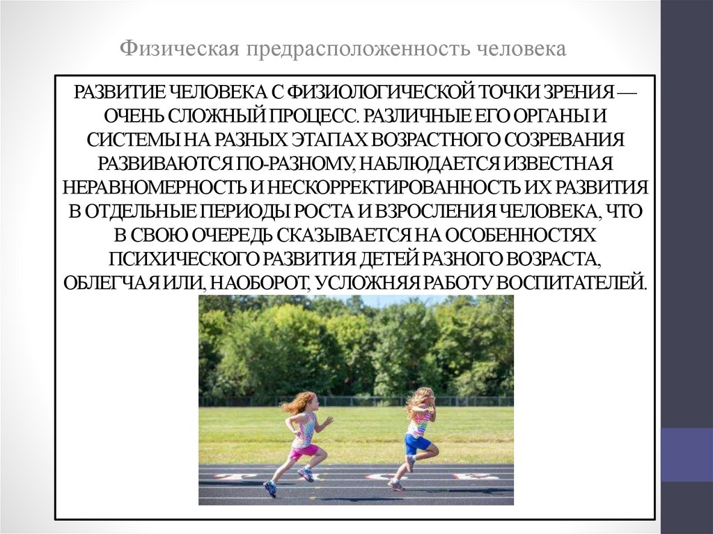 Физическая предрасположенность человекаРАЗВИТИЕ ЧЕЛОВЕКА С ФИЗИОЛОГИЧЕСКОЙ ТОЧКИ ЗРЕНИЯ —