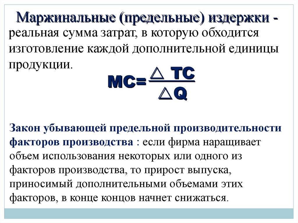 Маржинальные (предельные) издержки -реальная сумма затрат, в которую обходится