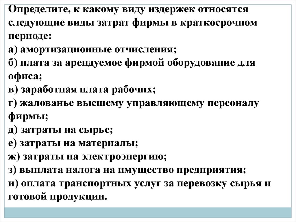 Определите, к какому виду издержек относятсяследующие виды затрат фирмы в краткосрочном