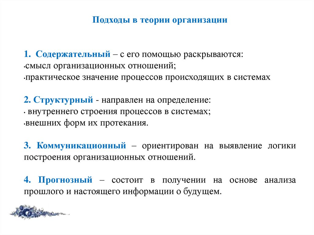 Подходы в теории организации1. Содержательный – с его помощью раскрываются: