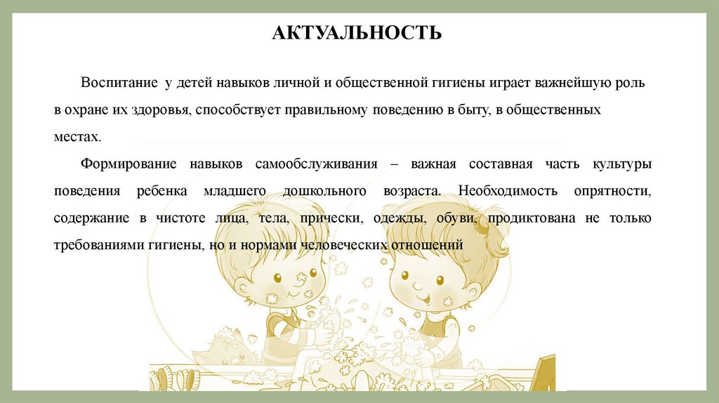 АКТУАЛЬНОСТЬВоспитание у детей навыков личной и общественной гигиены играет важнейшую роль