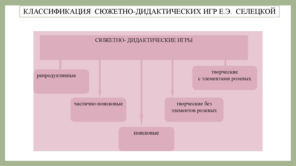 КЛАССИФИКАЦИЯ СЮЖЕТНО-ДИДАКТИЧЕСКИХ ИГР Е.Э. СЕЛЕЦКОЙСЮЖЕТНО- ДИДАКТИЧЕСКИЕ ИГРЫ