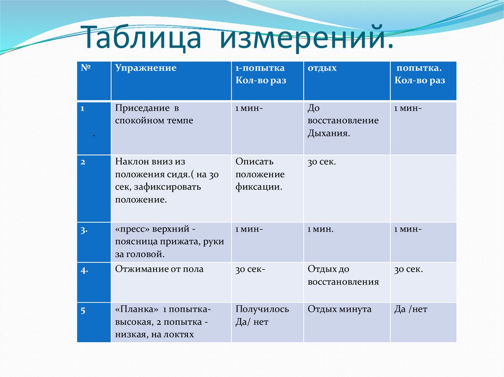 Результат измерений.1. В упражнение приседание количество раз