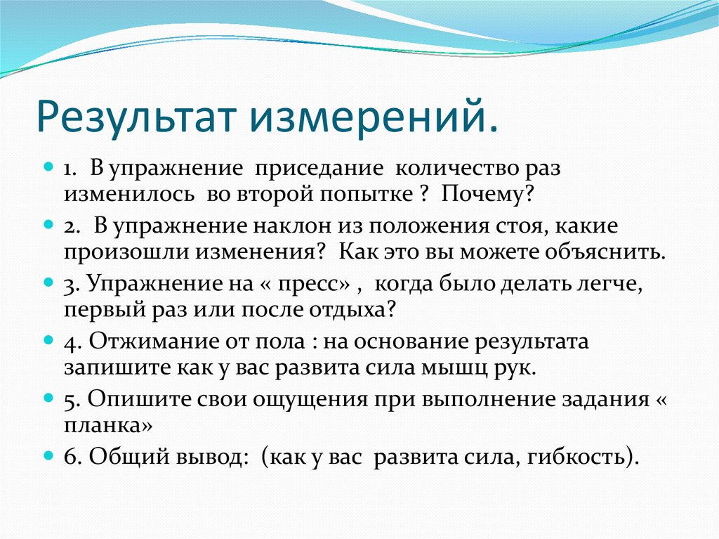 6. Общий вывод: (как у вас развита сила, гибкость).