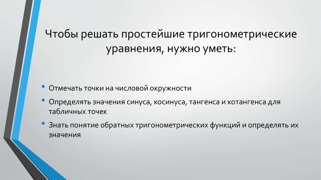 Чтобы решать простейшие тригонометрическиеуравнения, нужно уметь: