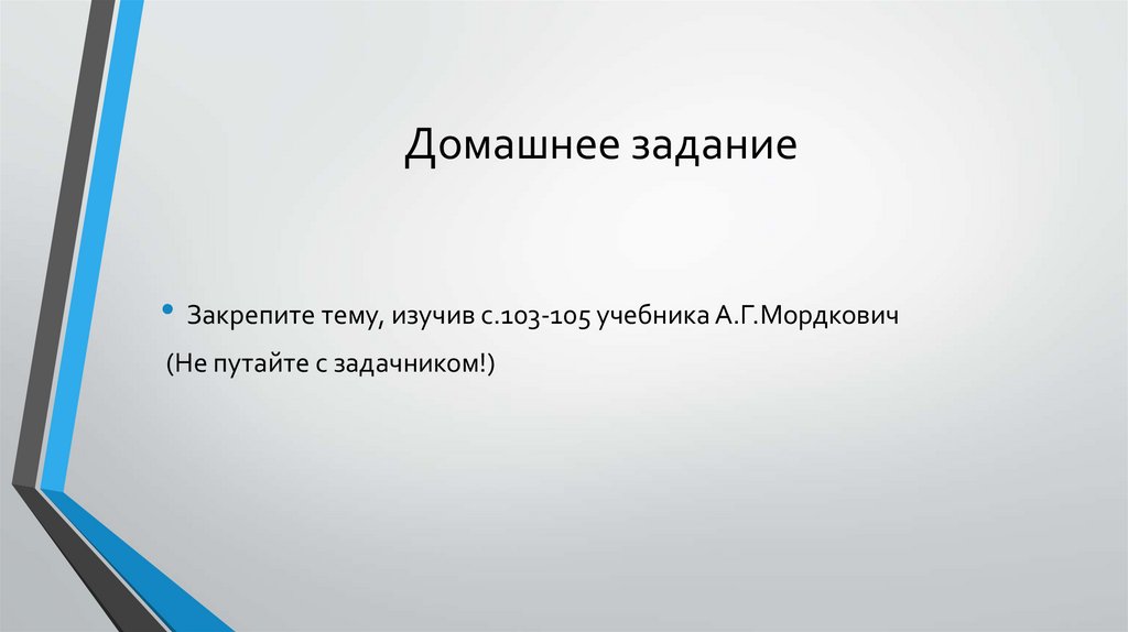 Домашнее задание• Закрепите тему, изучив с.103-105 учебника А.Г.Мордкович