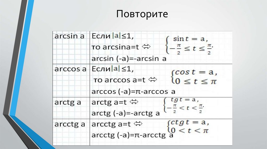 • Знать понятие обратных тригонометрических функций и определять их