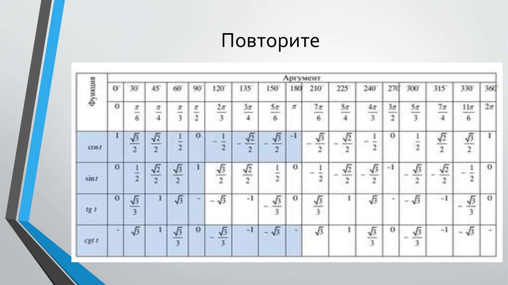 • Определять значения синуса, косинуса, тангенса и котангенса для