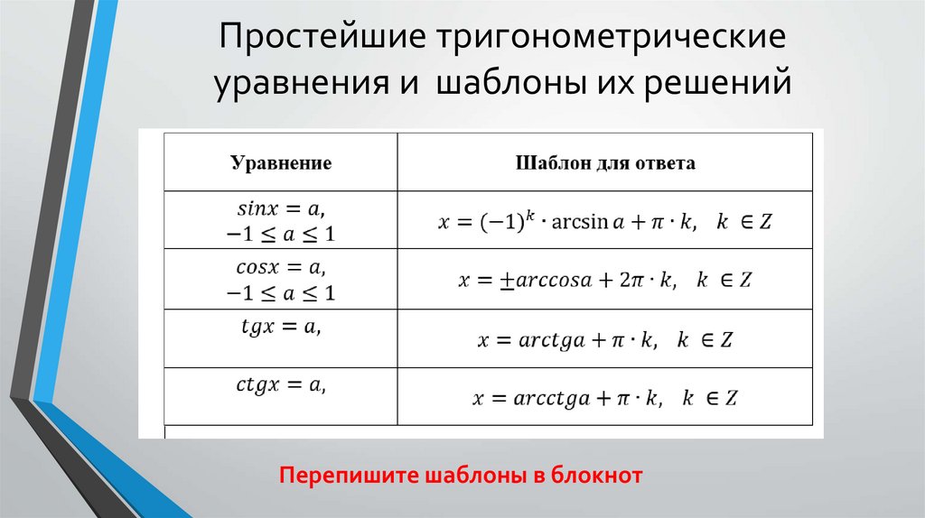 Простейшие тригонометрическиеуравнения и шаблоны их решений