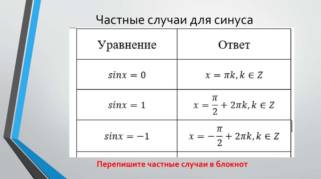 Частные случаи для синусаПерепишите частные случаи в блокнот