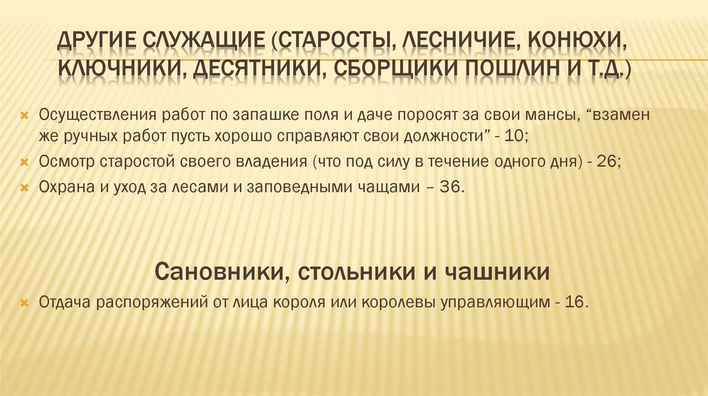 ДРУГИЕ СЛУЖАЩИЕ (СТАРОСТЫ, ЛЕСНИЧИЕ, КОНЮХИ,КЛЮЧНИКИ, ДЕСЯТНИКИ, СБОРЩИКИ ПОШЛИН И Т.Д.)