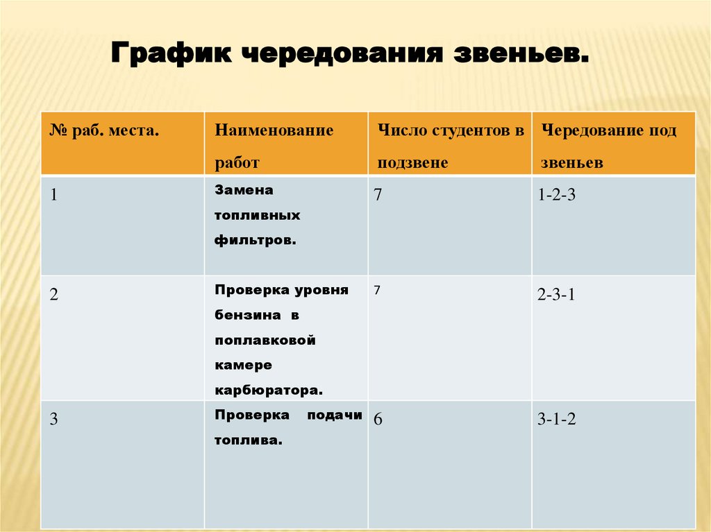 График чередования звеньев.№ раб. места.