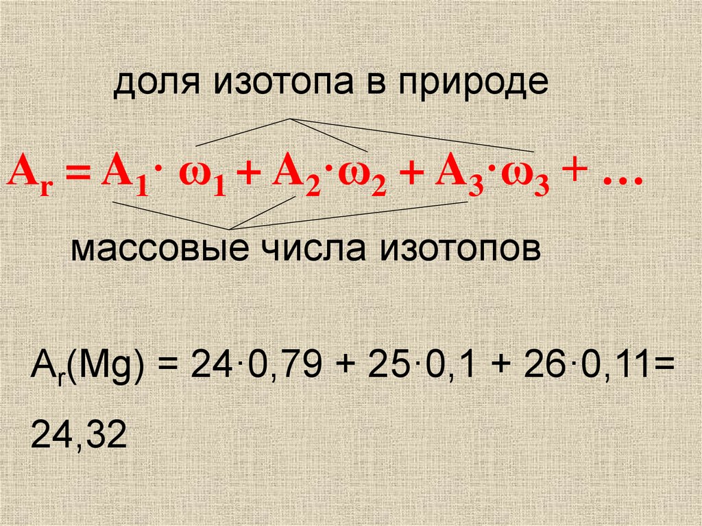 доля изотопа в природеАr = A1· ω1 + A2·ω2 + A3·ω3 + …