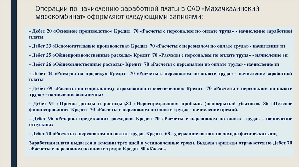 Операции по начислению заработной платы в ОАО «Махачкалинскиймясокомбинат» оформляют следующими записями: