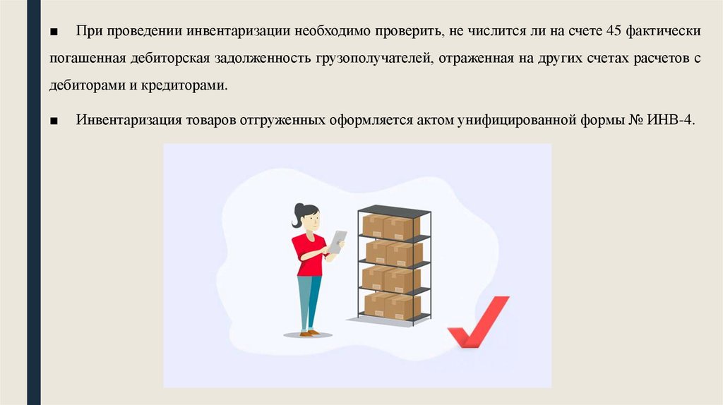 ■При проведении инвентаризации необходимо проверить, не числится ли на счете 45 фактически